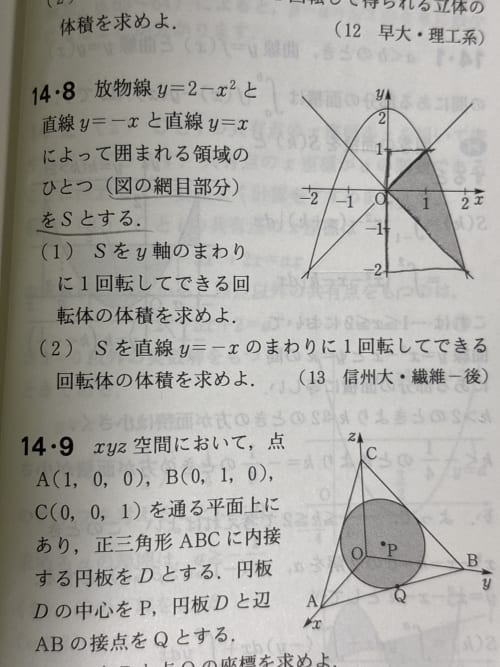 回答受付中 @staroverhead 2025/9/29 20:02 0 回答 回転体の問題です。14.8の(1)なのですが、自分は、x=√2-yとしてy=1からy=-2までをy軸回転した値を求めた後に、図の線で囲まれた部分の円錐を引くことで題意の体積を求めようとしたのですが、解答と値が一致しません。この解答の仕方は間違っていますか? 高校生数学数学Ⅲ この質問にはまだ回答がありません。あなたが最初の回答者になろう! 回答する シェアしよう! 回答(0件) この質問にはまだ回答がありません。あなたが最初の回答者になろう! 回答する