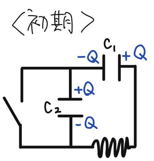電気振動?の問題だと思います。この初期状態からコイルに流れる電流が最大となった瞬間、スイッチを閉じた。スイッチを閉じてからコイルに流れる電流が初めて0になるまでの時間を求めよ。 がわかりません。電流が最大になるまでの時間はわかります。ただのコンデンサーが直列なだけの典型的な電気振動回路なので。T/4でπ√{LC1C2/(C1+C2)}/2ですよね。